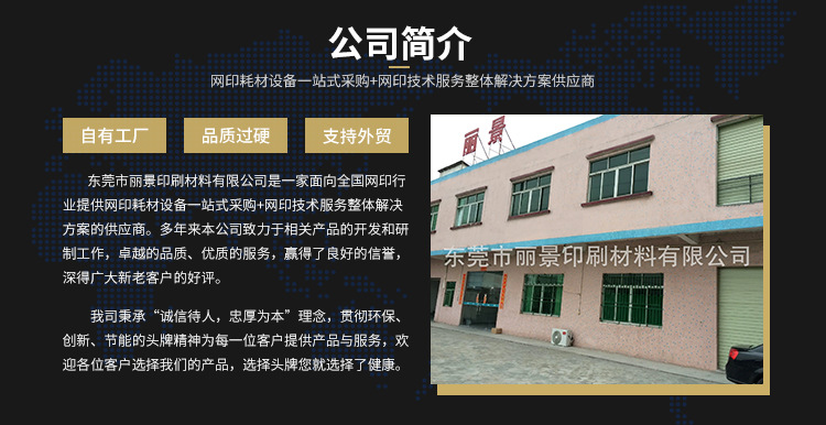 公司使命:追求全体员工物质和精神双幸福的同时,为客户提供一站式高品质网印耗材设备和服务,印出精彩世界!