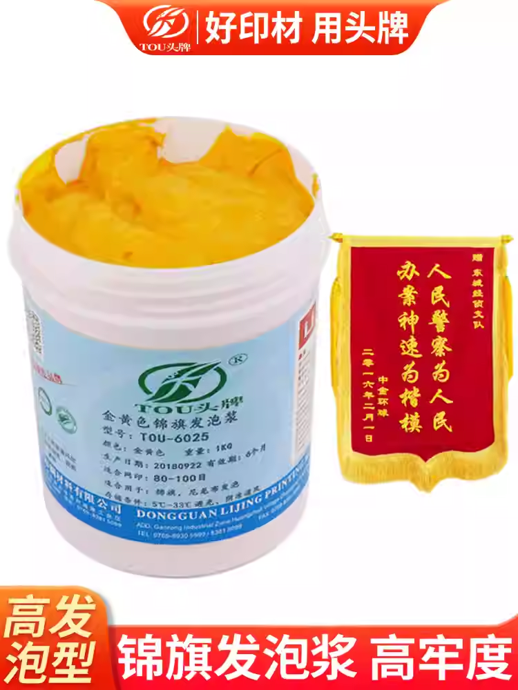 丽景6025锦旗黄色发泡浆是一款专为丝印工艺设计的高性能印花材料,适用于锦旗、绶带、服装等各类面料的高精度立体印花。该产品采用优质发泡配方,具有出色的弹性与立体感,印花后图案凸起明显,手感柔软且耐用性强。黄色发泡浆色泽鲜艳,附着力强,耐水洗、耐摩擦,确保印花图案长期保持清晰美观。产品操作简便,适合手工及机器印刷,是提升产品档次与视觉效果的理想选择。