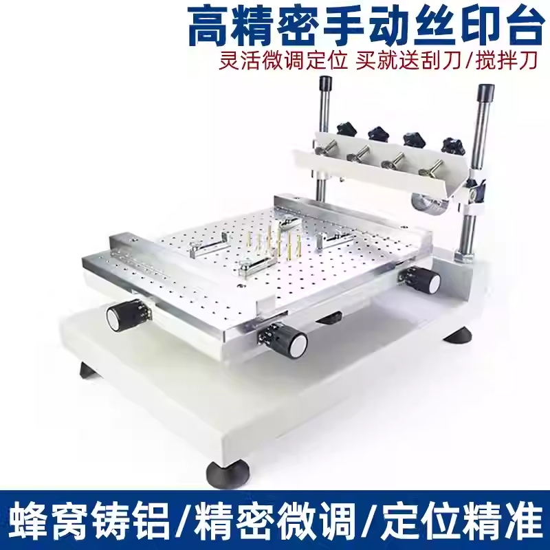 这款高精密丝印台专为SMT贴片、PCB打样、实验室小批量生产设计,微米级定位精度让每一次锡膏印刷都均匀、无偏移。整机采用加厚铝合金框架+阳极氧化处理,刚性强、耐腐蚀 。采用独特工期,机器结构稳固,操作简便,确保印刷精度和稳定性。适用于电子、电路板、标牌等多种平面丝网印刷场景,是您高效、精准印刷的理想选择。